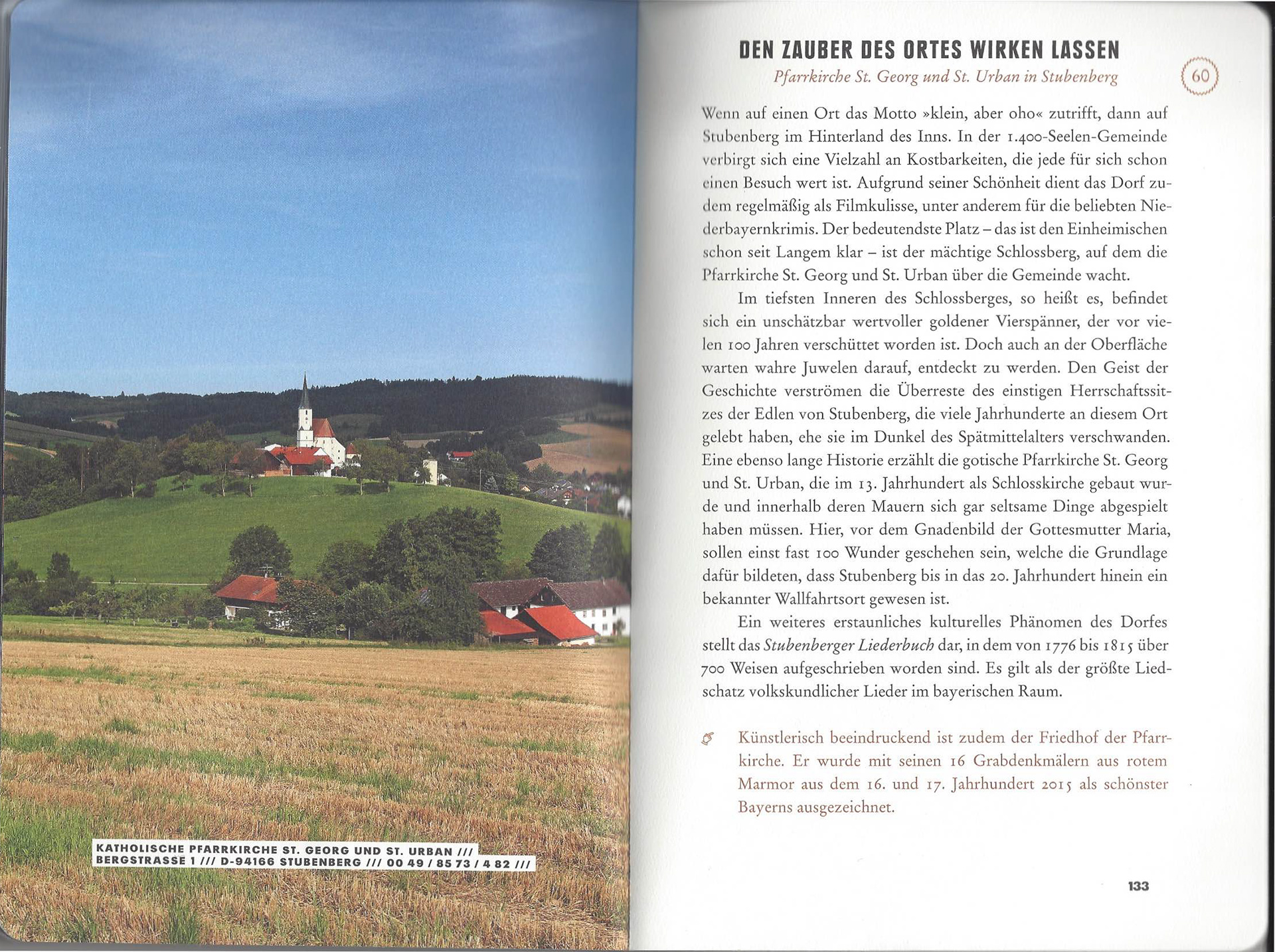 Wenn auf einen Ort das Motto „klein, aber oho“ zutrifft, dann auf Stubenberg im Hinterland des Inns. In der 1.400-Seelen-Gemeinde verbirgt sich eine Vielzahl an Kostbarkeiten, die jede für sich schon einen Besuch wert ist. Aufgrund seiner Schönheit dient das Dorf zudem regelmäßig als Filmkulisse, unter anderem für die beliebten Niederbayernkrimis. Der bedeutendste Platz – das ist den Einheimischen schon seit Langem klar – ist der mächtige Schlossberg, auf dem die Pfarrkirche St. Georg und St. Urban über die Gemeinde wacht.